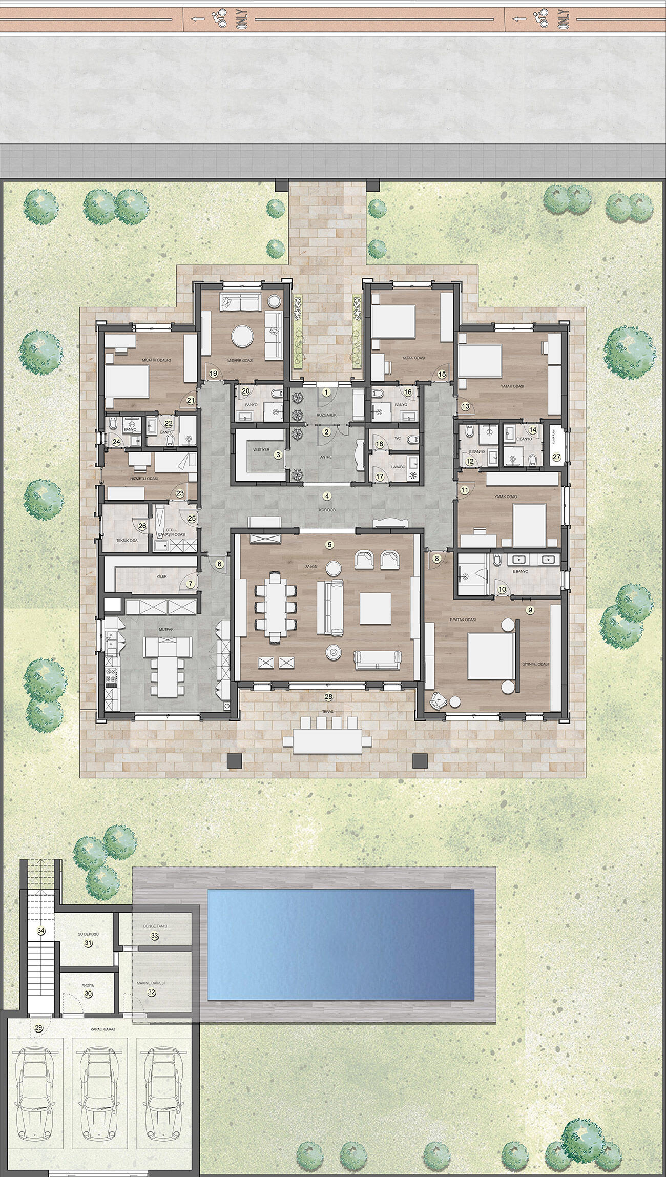 Muhteşem manzarasıyla sabahları mutluluk, akşamları ise huzur veren Villa Orkide, 1350 m2’lik bir alanda, 7 odalı ferah bir yaşamın adresi.